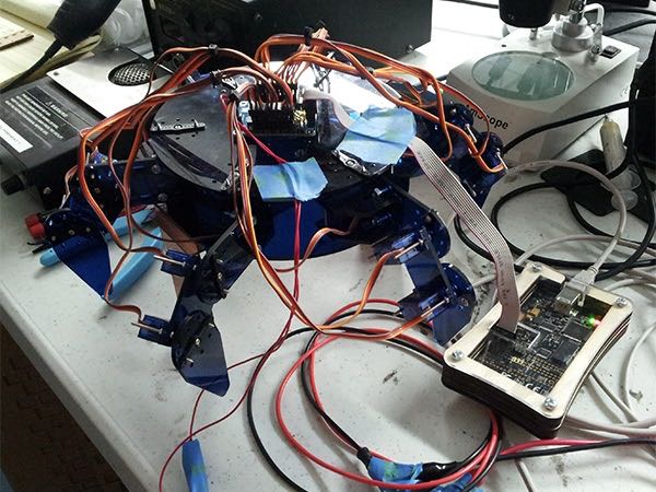 Hexapod robot capable of inverse kinematics for calculating walking sequences. A program was written that physically models the hexapod and records keyframes. This allows the user to create their own movement sequences which they can upload to the hexapod to play back.