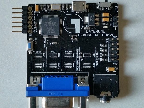 I designed, built, and manufactured a USB programmable board which allows you to write graphics & music demos and play them over a VGA monitor and audio jack. There are limited system resources and the goal is to write code and fit spectacular graphics effects with songs. You can write code in either ASM or C. One of the categories for the demo party is the Layerone Demoscene Board. The goal is to fit cool graphics and audio demos and to wow the audience at the Layerone Demo Party!